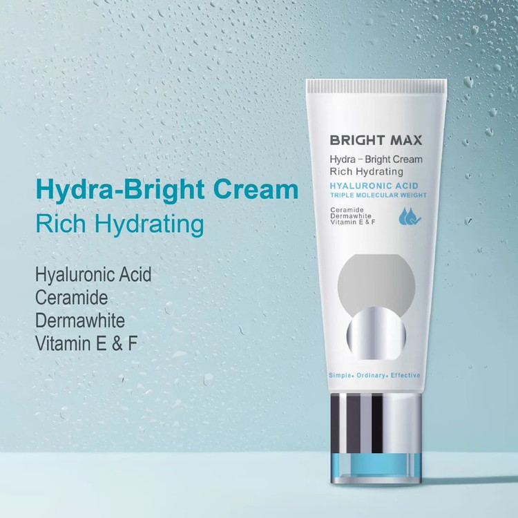 کرم آبرسان ریچ هیدرا-برایت برایت مکس برای پوست خشک و نرمال به جهت وجود هیالورونیک اسید با وزن مولکولی سه گانه باعث آبرسانی سریع پوست در لایه سطحی و عمقی میشود. علاوه بر این، استفاده از پنتنول نیز خاصیت آبرسانی این کرم را تقویت میکند و مانع از تبخیر آب لایه های پوستی میگردد.
