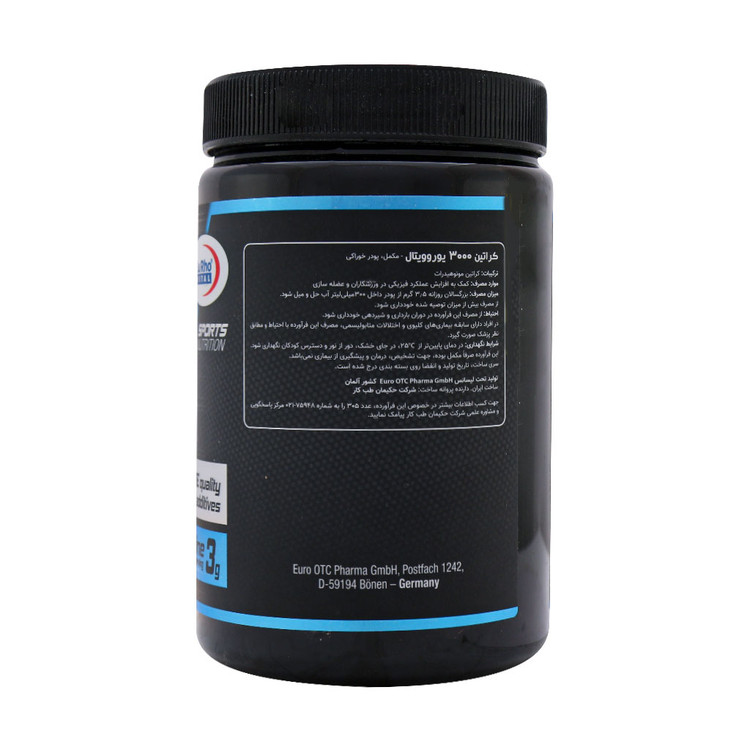 پودر کراتین 3000 یورو ویتال توسط کمپانی یورو او تی سی فارما در آلمان تولید شده است. این محصول در هر قوطی حاوی 250 میلی گرم پودر می باشد که به ازای هر 3.5 گرم پودر، حاوی 3.5 گرم کراتین منوهیدرات creapure می باشد.
