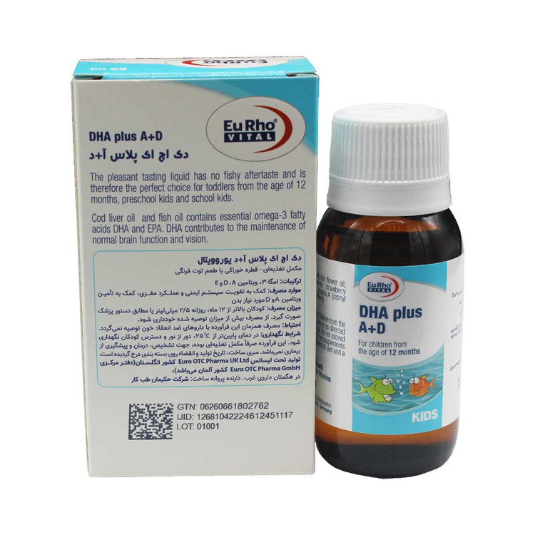 قطره ی آ+د یورویتال حاوی روغن ماهی دارای طعم مطلوب محصول که فاقد بو و عطر ماهی در هنگام مصرف می باشد، باعث می شود که این فرآورده انتخاب خوبی برای کودکان بالاتر از 12 ماه و کودکان در سنین قبل از مدرسه و دانش آموزان باشد.روغن کبد ماهی و روغن ماهی حاوی اسیدهای چرب امگا 3، DHA (دوکوزا هگزانوئیک اسید) و EPA (ایکوزا پانتونئیک اسید) میباشد.