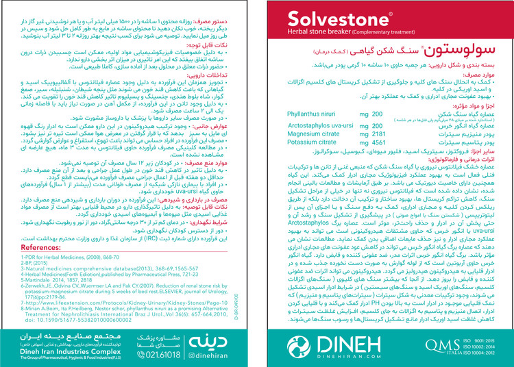 200 میلی گرم عصاره گیاه سنگ شکن، 200 میلی گرم عصاره انگور خرس، 4561 میلی گرم سیترات پتاسیم و 2181 میلی گرم سیترات منیزیم
