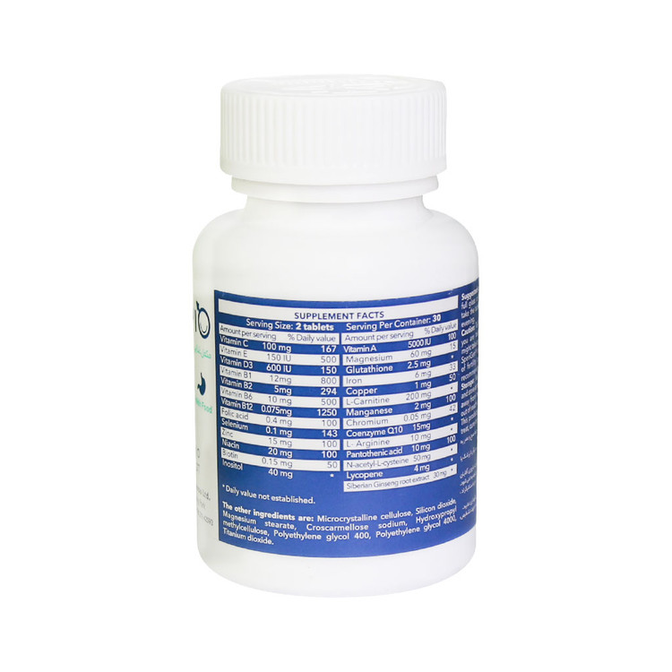 ویتامین های گروه B، ویتامین C، E، D، A،زینک، سلنیوم، آهن، کروم، منگنز، مس، منیزیم، استیل سیستئین، ال کارنیتین، ال آرژنین، لیکوپن، کوآنزیم Q10، گلوتاتیون، عصاره جینسینگ و اینوزیتول