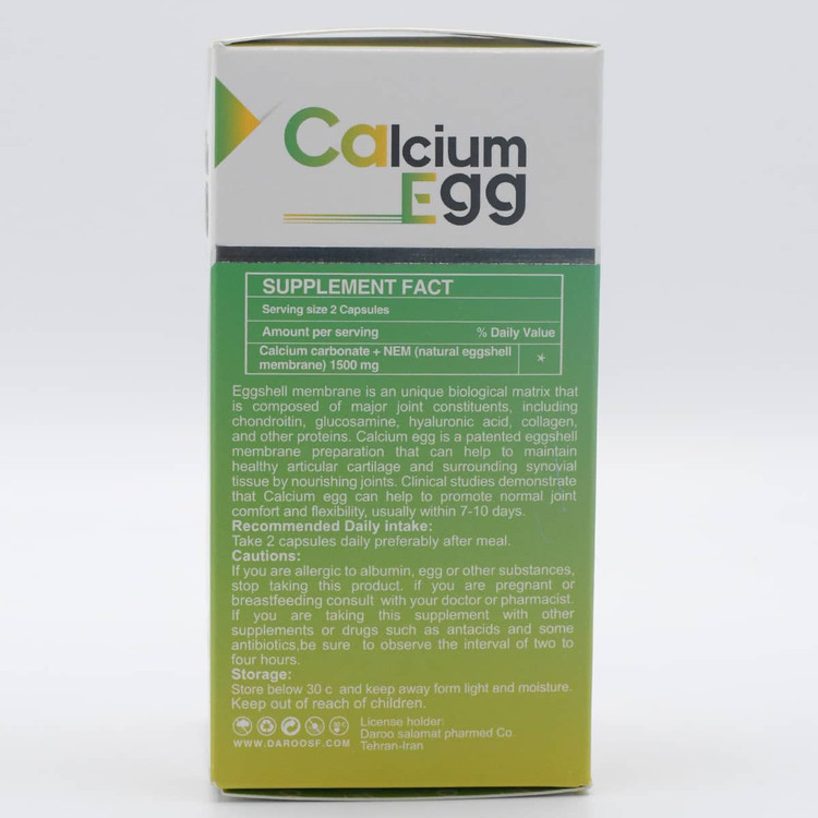 کپسول کلسیم اگ های هلث حاوی پودر پوسته تخم مرغ است. غشای پوسته تخم مرغ طبیعی یک گزینه موثر و ایمن برای درمان درد و سفتی مرتبط با آرتروز زانو است و در کوتاهترین مدت قادر است درد مفاصل را کاهش دهد و به تحرک آن کمک کند. پوسته تخم مرغ به عنوان منبع عالی از کلسیم، ۹۵ درصد از کربنات کلسیم تشکیل شده و تا ۹۰ درصد آن در انسان قابل جذب است.