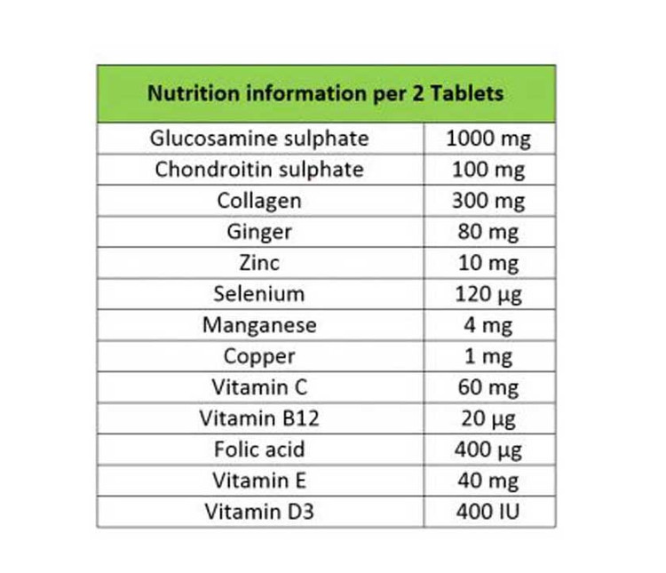 گلوکزامین، کندرویتین، کلاژن، کلسیم، عصاره زنجبیل، فولیک اسید، روی، منگنز، مس، ویتامین های B12، E، D3 و سلنیوم
