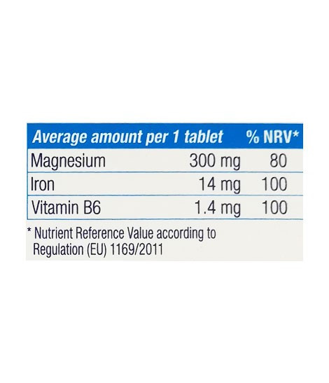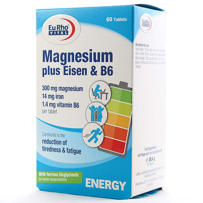 محصول منیزیم پلاس آیزن و ب6 یوروویتال به ازای هر قرص حاوی 300 میلی گرم منیزیم به فرم اکساید می باشد. این مکمل علاوه بر ماده معدنی منیزیم حاوی ویتامین ب6 و ماده معدنی آهن نیز می باشد که در ادامه به بررسی نقش آنها در این مکمل می پردازیم.