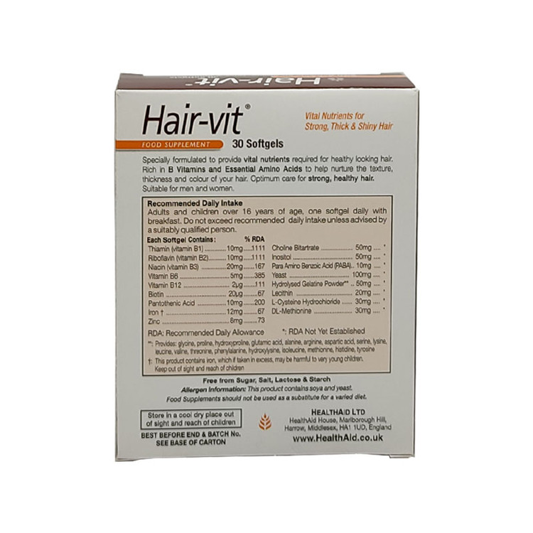 آهن جز اصلی ترین ترکیبات به کار رفته در hairvit برای حفظ سلامت پوست، مو و استحکام ناخن است. همچنین در ساخت DNA به ویژه در سلول های مو نقش دارد. در زمان فقر آهن، بدن نمیتواند هموگلوبین مورد نیاز را تولید کند و در نتیجه اکسیژن کافی برای رشد و ترمیم سلولهای بدن از جمله سلولهای تحریک کننده رشد مو فراهم نمی شود. ریزش مو یکی از عوارض کم خونی ناشی از فقر آهن است که با دریافت مکمل آهن برطرف می شود.