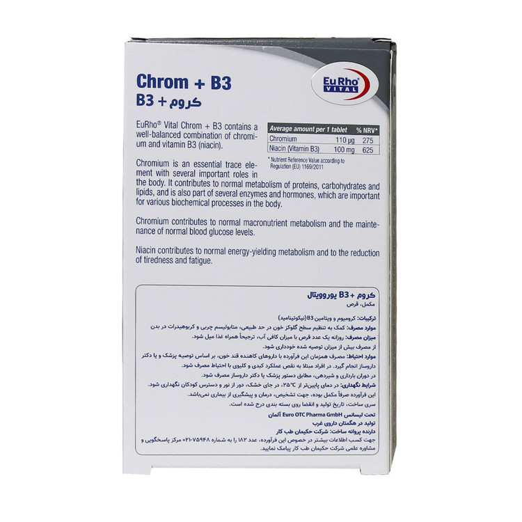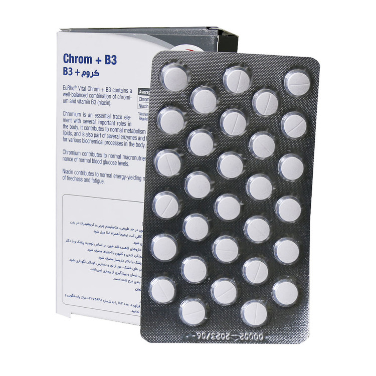 قرص کروم و ویتامین B۳ یوروویتال به تقویت عملکرد انسولین و کنترل قند خون، کاهش وزن و چربی سوزی کمک میکند. تنظیم متابولیسم بدن و درشت مغذیهای رژیم غذایی نقش مهمی در پیشگیری از بروز بیماریهای متابولیک از جمله دیابت، چاقی و افزایش چربی خون ایفا میکند. کروم موجود در این قرص یکی از ضروری ترین مواد معدنی جهت تنظیم متابولیسم، تقویت عملکرد هورمون انسولین و در نتیجه حفظ سلامت بدن است. همچنین در این محصول ویتامین B۳ جهت تنظیم متابولیسم دیده میشود.