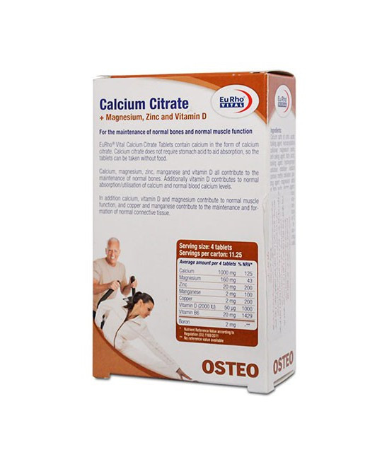 کلسیم سیترات یورو ویتال یک مکمل تغذیه ای تخصصی متشکل از کلسیم، منیزیم، ویتامین D3، روی، منگنز، مس، ویتامین B6 و برون است که به منظور حفظ سلامت استخوانها و پیشگیری از پوکی استخوان طراحی شده است. قرص کلسیم یورو ویتال حاوی کلسیم سیترات است. کلسیم سیترات در مقایسه با سایر املاح کلسیم، دارای انحلال پذیری بهتر، جذب و اثربخشی بیشتر و عوارض گوارشی کمتری میباشد. این مسئله قرص کلسیم سیترات یوروویتال را به مکملی مناسب برای افراد مبتلا یا مستعد به سنگ کلیه، گرفتگی عروق و ناراحتیهای گوارشی تبدیل نموده است.