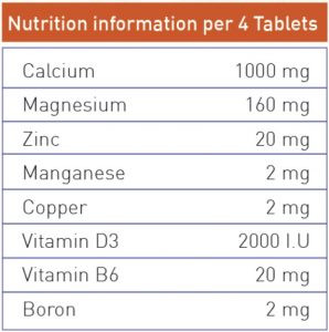 حاوی کلسیم با ملح سیترات، منیزیم، روی، مس، ویتامین D3 ، ویتامین B6 و بور
