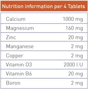 حاوی کلسیم با ملح سیترات، منیزیم، روی، مس، ویتامین D3 ، ویتامین B6 و بور