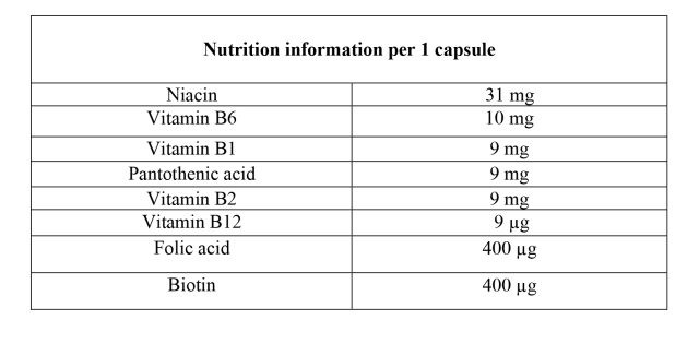 حاوی ژلاتین، روغن دانه سویا، گلیسرول، نیکوتینامید، ویتامین B6، ویتامین B1، پانتوتنات دی کلسیم، ویتامین B2، بیوتین، لسیتین سویا، موم زنبور عسل، آیرون اکساید، فولیک اسید و ویتامین B12