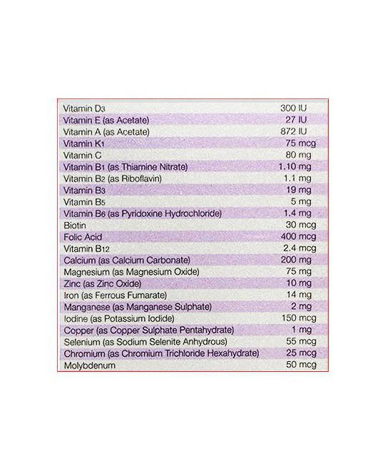 - ویتامین K: ویتامین K یک ویتامین محلول در چربی است که به دو صورت وجود دارد. ویتامین K به ساخت پروتئین های مختلف که برای لخته شدن خون و ساخت استخوان ها ضروری هستند، کمک می کند. پروترومبین یک پروتئین وابسته به ویتامین K است که مستقیما با لخته شدن خون در ارتباط است. استئوکلسین نیز پروتئین دیگری است که برای تولید بافت استخوانی سالم به این ویتامین نیاز دارد. میزان ویتامین K1 موجود در این محصول به ازای هر قرص 75 میکروگرم می باشد.