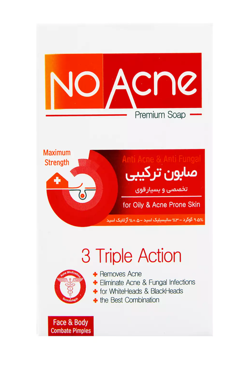 ترکیبات آزلائیک اسید و گوگرد در صابون شستشو نو آکنه مدل Triple action، میزان چربی سطح پوست را تنظیم نموده و مانع از مسدود شدن منافذ و بروز آکنه می گردند؛ این دو ماده همچنین، با خاصیت ضد میکروبی، از رشد و تکثیر باکتریهای مولد آکنه ممانعت به عمل می آورند.