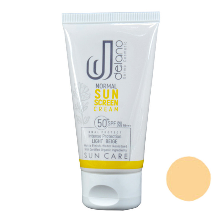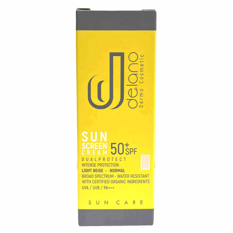 کرم ضد آفتاب رنگی پوست نرمال و خشک SPF 50 دلانو یه خوبی از پوست در برابر اشعه های مضر نور خورشید محافظت نموده و مانع از بروز آثار زیان بار آفتاب بر پوست، مثل پیری پوست زودرس می گردد. این کرم ضد آفتاب در برابر تعرق و آب مقاوم است و اثر محافظتی آن تا سه ساعت بعد از استفاده بر روی پوست باقی می ماند.