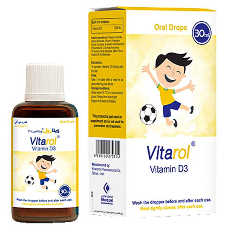 قطره ویتامین د3 ویتارول توسط شرکت داروسازی خوارزمی تولید شده است. این مکمل در حجم 30 میلی لیتر در بطری شیشه ای می باشد. این محصول حاوی یک قطره چکان برای اندازه گیری است.برای رشد استخوان، تشکیل دندان، تنظیم سیستم ایمنی، رشد و تقسیم سلولی در کودکان ضروری است. کمبود ویتامین D ممکن است باعث ایجاد نرمی استخوان (راشیتیسم) در نوزادان و کودکان در سنین رشد شود؛ راشیتیسم شدید علاوه بر تغییر شکل استخوان و درد، می تواند باعث عدم رشد، تأخیر در رشد، تشنج ناشی از کمبود کلسیم و ناهنجاری های دندانی شود.