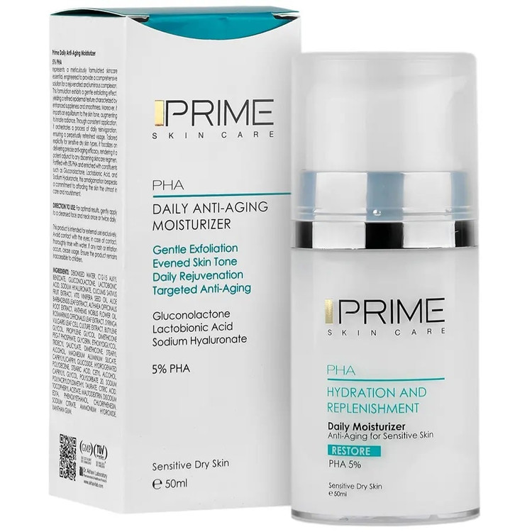 کرم بازسازی کننده و آبرسان صورت پرایم بر پایه 5 درصد PHA یا پلی هیدروکسی اسید و ترکیبات فعال دیگری همچون گلوکونولاکتون، لاکتوبیونیک اسید و سدیم هیالورونات در قالب بطری های پمپ دار 50 میلی لیتری تولید و عرضه می شود. گلوکونولاکتون این محصول در لایه برداری و حذف سلول های مرده و تقویت سد دفاعی پوست نقش داشته و وضعیت بافت آن را بهبود می بخشد.